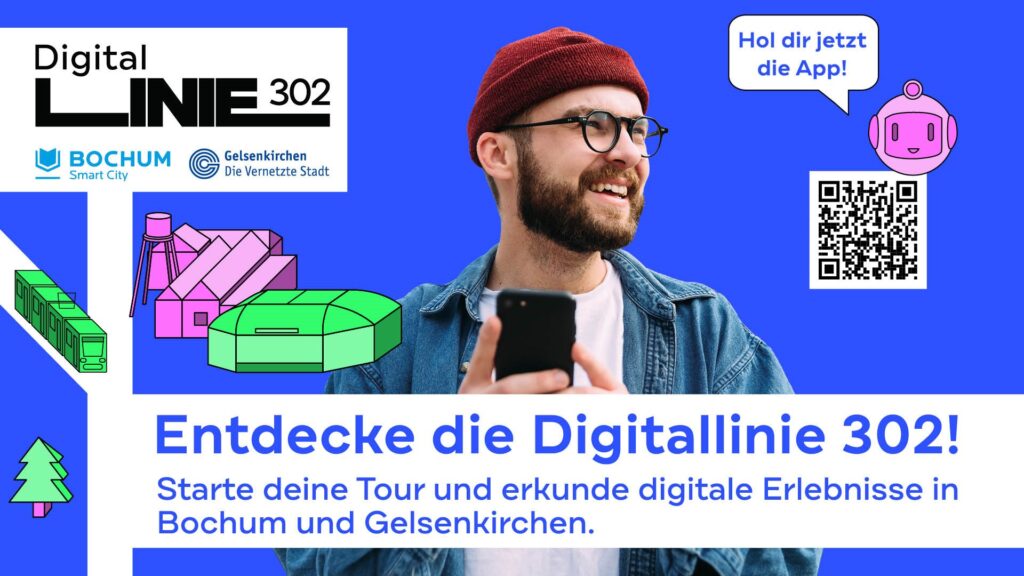 Willkommen auf der digitalen Reise – Die Straßenbahn 302 wird zur digitalen Erlebnisroute und führt uns bei diesem Stadtlabor zu Besuch an einigen digitalen Highlights unserer Stadt vorbei – von smarter Mobilität bis hin zu nachhaltigen Lösungen. Mach dich bereit für einige spannende Einblicke in innovative Technologien und ihre Anwendung im Alltag. Ob Klimaschutz, Vernetzung oder digitale Arbeitsplätze – die Digitallinie 302 zeigt, wie Bochum und Gelsenkirchen zu Smart Cities werden.